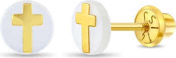 Graceful and meaningful, these round mother of pearl earrings are a beautiful addition to any little girl’s jewelry collection. Each luminous piece features a smooth mother of pearl surface with a delicate gold cross at its center, creating a timeless and elegant design. Crafted from genuine 14k yellow gold, these earrings are gentle on sensitive skin and perfect for both everyday wear and special occasions. Finished with a secure safety screw back closure, they provide a comfortable fit and stay safely in place all day long. Gift box included.