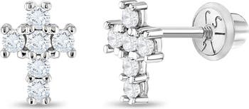 Looking for a simple and comfortable devotional gift for your baby girl? These tiny, delicate cross screw back earrings are perfect! Entirely crafted in 14k white gold a precious material which is suitable for your baby girl's small sensitive ears. These are fashionable with its stunning six cubic zirconia stones and securely fitted with safety screw backs so you don't have to worry about your baby girl losing one. Enjoy their simplicity for any occasion and especially for every special religious events such as a Baptisms or Holy Communions. Gift box included.