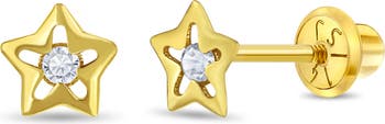 Add a touch of sparkle to your little one's style with these charming star-shaped earrings. Crafted from 14K yellow gold, each delicate star features a brilliant clear cubic zirconia stone at its center, shining with every movement. Designed for both comfort and security, these lightweight earrings are secured with 14K yellow gold screw-back closures for a snug and reliable fit. For everyday wear or special occasions, these dazzling star earrings make a wonderful gift for any child who loves a little extra sparkle. A gift box is included with purchase.