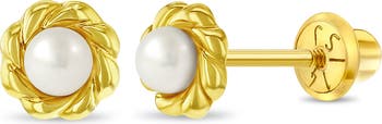 These adorable little girl's cultured pearl 14k gold earrings are set in a unique and classic braided bezel setting. Crafted entirely of solid 14k gold, these baby pearl earrings with screw backs are suitable for kids with sensitive ears. Its small size is perfect for children of ages from 1 through 10 years of age. Featuring a unique safety screw back system, these earrings help to ensure your little girl's 14k gold pearl earrings will stay safely and comfortably in place. A complimentary gift box is included!