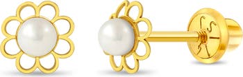 Floral jewelry for kids is a lovely and classy way to add a style on her look! A touch of sparkle from these 14k yellow gold studs frames her face in springtime. These freshwater cultured pearl stud earrings for girls are fashionable and carefully crafted in 14k gold, a precious material that is suitable for young girls with sensitive skin. For extra comfort and security these pearl earrings have safety screw backs for your toddler-on-the-go. Gift box included.