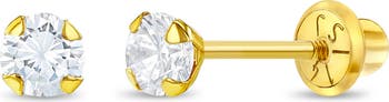 These beautiful four prong set cubic zirconia earrings were crafted in 14k yellow gold, a precious material which is suitable for babies and little girls with sensitive ears. Features a 3mm round cz gems for a sparkly touch in front. High polished for long lasting shininess and durable quality, these classic and timeless earrings for girls come with screw backs which is a safety back that screws on and locks thus preventing for any poking in the back of the earlobe and lessening chances of lost earrings. Gift box included.