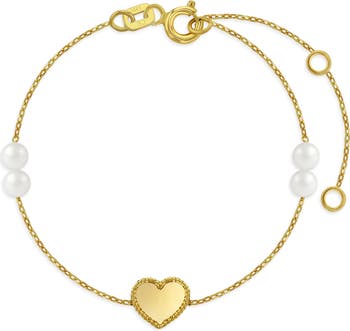 This little girl’s bracelet is a cherished keepsake made from genuine 14k yellow gold. Along the delicate chain are lustrous freshwater cultured pearls, adding a touch of classic beauty. At the center rests a polished gold heart, lovely for engraving with an initial or name to create a personalized gift she'll treasure. Measuring 5.5 inches with a .5 inch extension, it offers a secure and adjustable fit for growing wrists. Ideal for birthdays, christenings, or memorable milestones, this bracelet is a meaningful piece designed just for her. A small gift box is included with purchase.