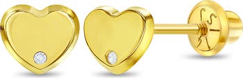 Simple and adorable pair of heart earrings that sure to become your most favorite jewelry set when dressing your little one. Beautifully crafted entirely in genuine 14k yellow gold with a diamond accent. This pair of heart earrings is suitable for your little ones with sensitive ears. The screw backs assure they won't fall off and will fit comfortably on your child's earlobe. Order a pair of these lovely heart earrings for girls today and we'll include a lovely little gift box.