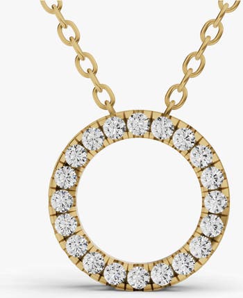 14K yellow gold circle diamond necklace set with lab grown round cut diamonds. Diamonds are arranged in a continuous circular pendant, creating balanced sparkle with a clean, timeless silhouette. The necklace features an 18 inch chain and is set with 20 stones, delivering refined brilliance in an elegant everyday design. Total diamond weight is 0.75 carats.