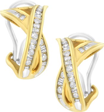 This timeless earring design is fashioned in 14k yellow gold and showcases 1/2 a ct TDW of glimmering diamonds. Yellow gold ribbons inlaid with alternating round and baguette cut diamonds cross over each other and create an X shape design. An omega back mechanism secures the earring.