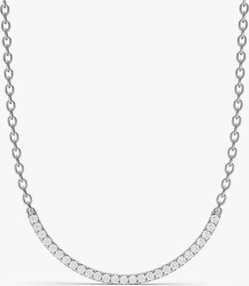 14K white gold round diamond smiley pendant necklace set with lab grown round cut diamonds totaling 1.00 carat. Diamonds are arranged in a curved smiley design to create even sparkle and a playful yet refined silhouette. The necklace features an 18 inch chain and is set with 21 stones, offering a modern, joyful piece designed for everyday wear and layering.