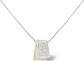 Elegant and timeless, this luxe pendant necklace boasts gorgeous princess cut diamonds in genuine 14K gold. The pendant features a dual rectangle foldover design with each rectangle filled from edge to edge with invisible set square stones. The pendant has an incorporated bail and slides along a box chain necklace with a spring ring clasp. The contemporary yet classic 18" box chain complements any neckline beautifully. This authentic design is crafted of real 14 karat gold, a precious metal that will keep a tarnish-free shine for years to come. It comes in your choice of 14K white gold or two-tone 14K white and yellow gold. It also comes in your choice of 1.0 or 2.0 carat total weight of diamonds. This sweet necklace makes a great gift for any special occasion! Whether worn for daytime glamour or evening sparkle, this necklace is gorgeously versatile. Coordinate it with your favorite diamond earrings or other diamond jewelry to create a complete and elegant ensemble.