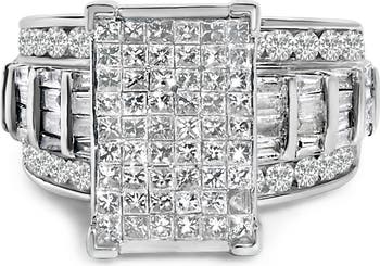 Uplift your style statement with this wonderful Square shaped diamond ring. Fashioned in cool 14kt white gold, this fashion ring features the arrangement of round, princess, and baguette-cut diamonds. Framed in channel setting, the captivating look of this ring makes it a must have for every woman.