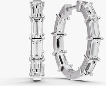 14K white gold oval fancy hoop earrings set with lab grown oval cut diamonds totaling 2.00 carats. Diamonds are arranged along the hoop to create continuous sparkle and a smooth, elegant silhouette. The hoops measure 0.693 inches in length and are set with 18 stones, offering a refined statement designed for everyday wear.