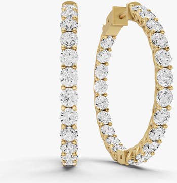 14K yellow gold Lucida in and out hoop earrings set with round cut lab grown diamonds totaling 3.00 carats. Diamonds are placed along the inner and outer edges of the hoop to create continuous brilliance from every angle. The hoops measure 1.136 inches in length and are set with 44 stones.