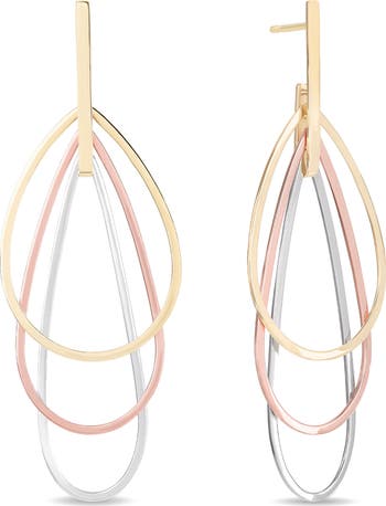 A trio of mix-tone teardrops bring modern shape to these 14-karat-gold frontal hoop earrings.