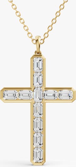 14K yellow gold emerald cross diamond pendant necklace set with lab grown emerald cut diamonds. Diamonds are arranged along the cross pendant to create a clean, architectural silhouette with refined brilliance. The necklace features an 18 inch chain and is set with 11 stones, offering a balanced and elegant statement. Total diamond weight is 5.00 carats.