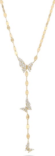 A trio of dynamic butterflies glitter with pavé diamonds in this 14-karat-gold necklace that's refined and playful.