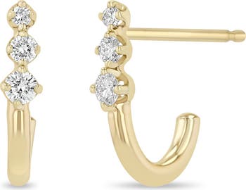 Graduated diamond trios top 14-karat-gold earrings shaped to hook around the base of your lobes.