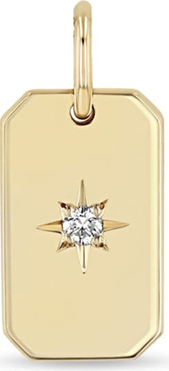 A starburst engraving beams with a single prong-set diamond at the center of this dog-tag charm crafted from 14-karat gold.