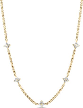 Twinkling diamonds are stationed around a beautiful box chain necklace in 14-karat gold.