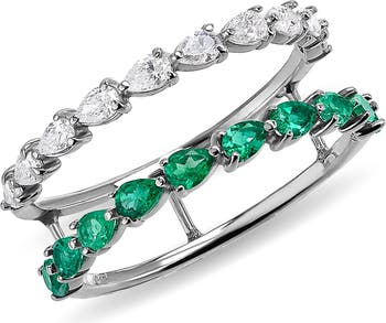 A stacked silhouette holds glittering emeralds and diamonds in this 14-karat-gold ring.