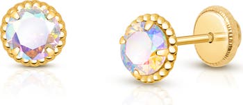 Colorful and playful like her spirit, these 14K gold earrings feature opalescent CZs. Hypoallergenic, comfy, and secure with screw backs for safe wear.