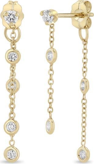 Bezel-set diamonds float on dainty chains in these 14-karat-gold earrings that string shine from the front of your lobes to the back.