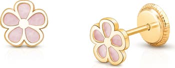 14K Gold Genuine Bloom Mother of Pearl Flower Studs Screw Back Earrings