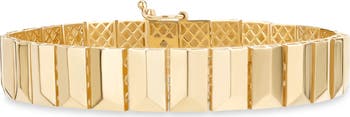 Light flashes off the flat surface of the 14-karat gold tiles that comprise this thin band ring ready to highlight any look, day or night.