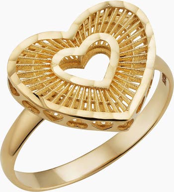 Crafted in Italy from exquisite 14k gold, our Icon Heart Ring offers a dazzling play of light that captures attention with every movement. Delicate cut-out hearts line the rim for a little romance, while a handcrafted design adorns the surface for some sophistication.