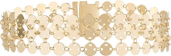 Three rows of gilded paillettes bring chainmail-inspired shine to your ensemble when you accessorize with this statement-making bracelet crafted from polished 14-karat yellow gold.