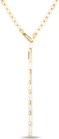 Square links lie flat to bring a modern glint to this 14-karat-gold lariat finished with cascading rectangular links at the drop.