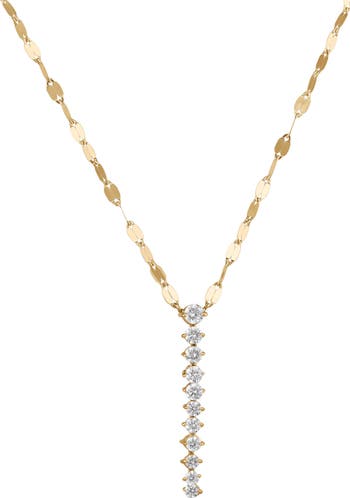 Graduating bright-white diamonds dazzle along the lariat profile of a mirror chain necklace crafted from 14-karat gold.