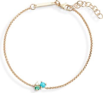 A clustered pendant prong-set with a turquoise cabochon, diamond and emerald brings color and sparkle to this chain bracelet in gleaming 14-karat yellow gold.
