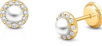 Crafted in 14K gold with a sparkling halo and genuine pearl, these earrings are hypoallergenic, made for kids, and arrive in signature gift wrapping.