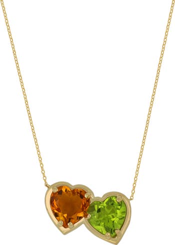 A double-heart pendant glitters with peridot and citrine stones on this handcrafted necklace made from warm 14-karat gold.