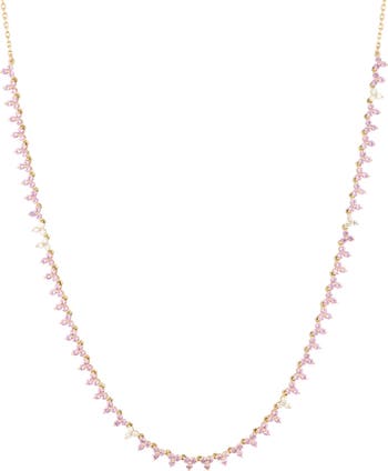 Gorgeous petal-pink sapphires are interspersed with brilliant diamonds on this 14-karat-gold necklace that brings delicate color and sparkle to your décolletage.