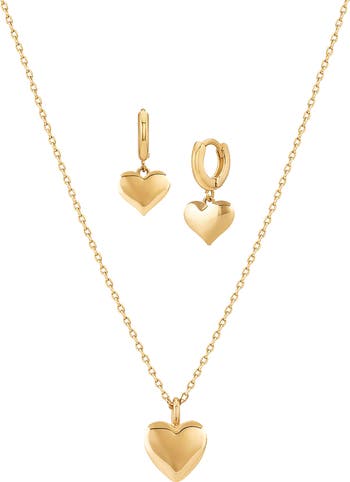 14k Gold Plated Puffed Heart Necklace & Huggies Set Holiday Gift Idea