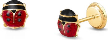 These 14K gold ladybug earrings with red and black enamel are hypoallergenic, comfy, and secure. A darling gift your little love bug will treasure.