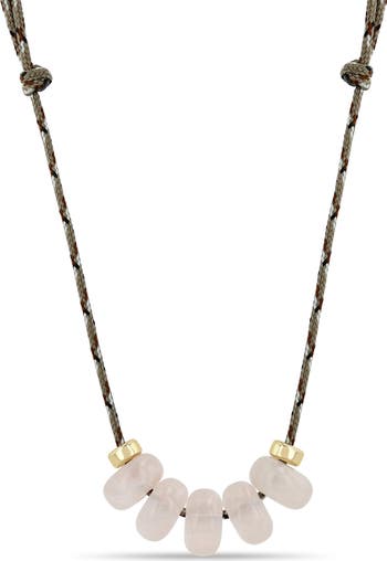 A line of rose quartz is flanked with 14-karat-gold beads in this beachy necklace that adjusts to your liking on sliding paracord.