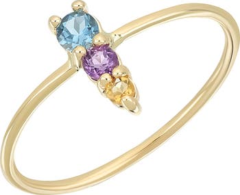 A graduating line of sparkling semiprecious stones lights up this delicate ring made from high-polished 14-karat gold.