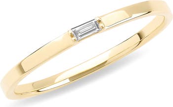 A single baguette diamond shines on a gleaming band ring of 14-karat gold that would be a great addition to any stack.