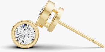 Round bezel studs crafted in 14k yellow gold and set with lab grown diamonds totaling 0.25 carats. The round brilliant cut brings clean, balanced sparkle with E color, VS1 clarity, and an Excellent cut. A polished bezel frames the stone for a smooth, modern finish.