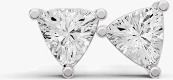 These trillion cut solitaire studs are crafted in solid 14k white gold. Each pair features lab grown diamonds totaling 0.25 carats, graded E color and VS1 clarity with an Excellent cut. The geometric triangular silhouette delivers modern sparkle with a clean, minimal profile for everyday wear.