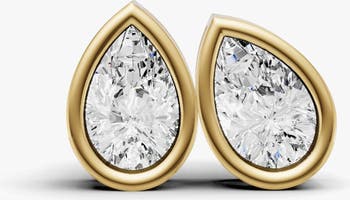 Pear bezel solitaire studs crafted in solid 14k yellow gold and set with lab grown diamonds totaling 0.50 carats. The pear cut offers an elegant teardrop profile enhanced by E color, VS1 clarity, and an Excellent cut. A smooth bezel frame provides a modern finish with secure, comfortable wear.
