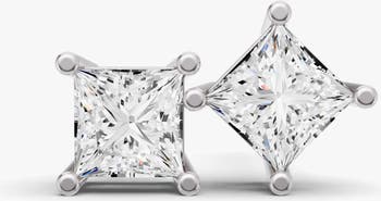 These princess cut solitaire studs are crafted in solid 14k gold. Each pair features lab grown diamonds totaling 0.50 carats, graded E color and VS1 clarity with an Excellent cut. The sharp square silhouette of the princess cut delivers clean lines and modern brilliance for everyday wear.