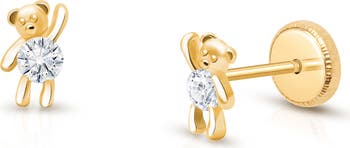 A sweet symbol of friendship, these 14K gold teddy bear earrings are hypoallergenic and made for kids with secure screw backs for all-day comfort and safety.