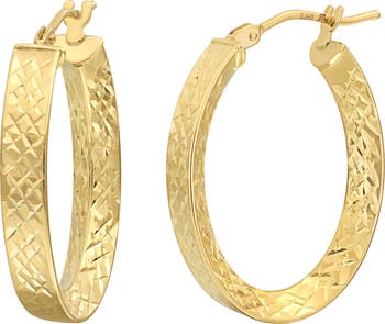 A faceted design allows light to reflect from every angle of these large, textured hoops handcrafted in 14-karat gold.