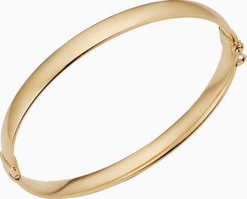 The One Bold Bangle is easy to love. With a sleek hinged design, this bracelet will add polished shine to any wrist stack or stand out solo as your go-to solid gold piece.