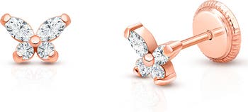 Spread your wings with these 14K gold butterfly earrings featuring four dazzling CZs. Hypoallergenic and designed for little ones to shine and soar.