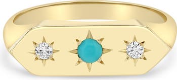 Sparkling diamonds and vibrant turquoise stones burst at the center of this signet ring cast in gleaming 14-karat gold.