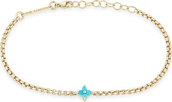 This 14-karat-gold bracelet features a turquoise flower centering a box chain for dainty color and a refines look.