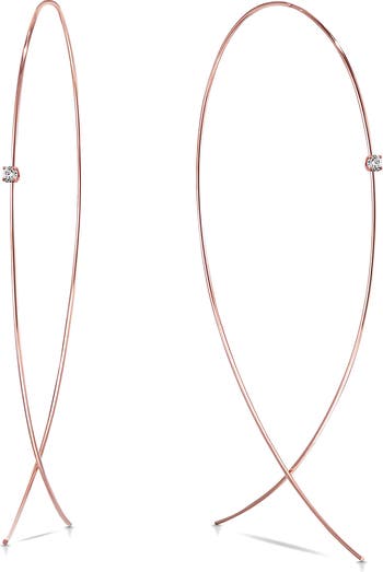 Two sparkling diamonds accent the front of these streamlined hoop earrings designed with slender gold wires that delicately thread the ear.